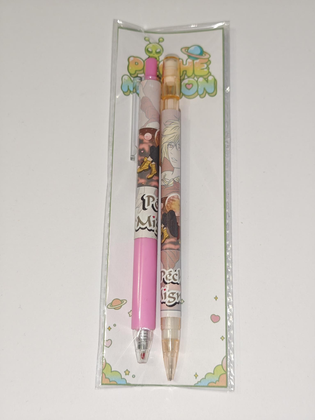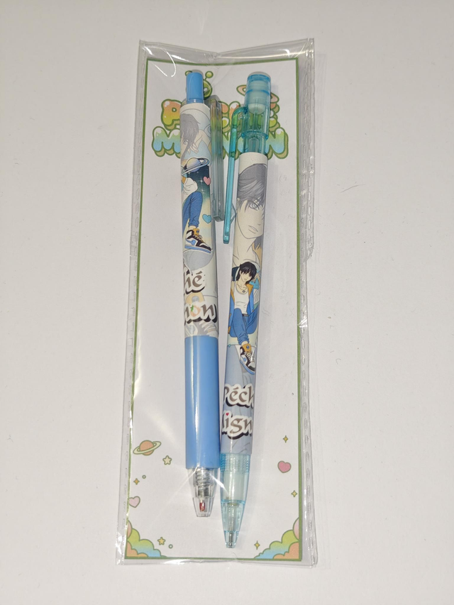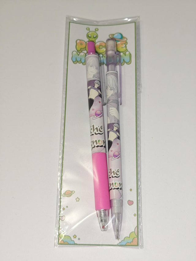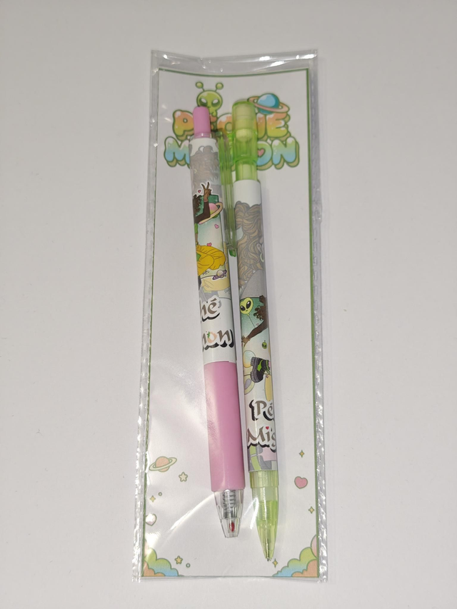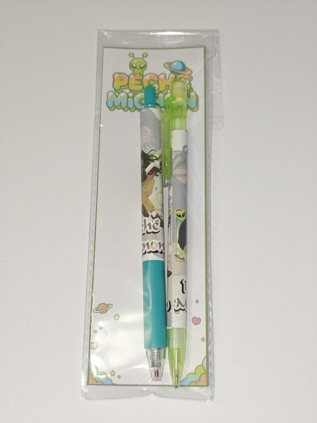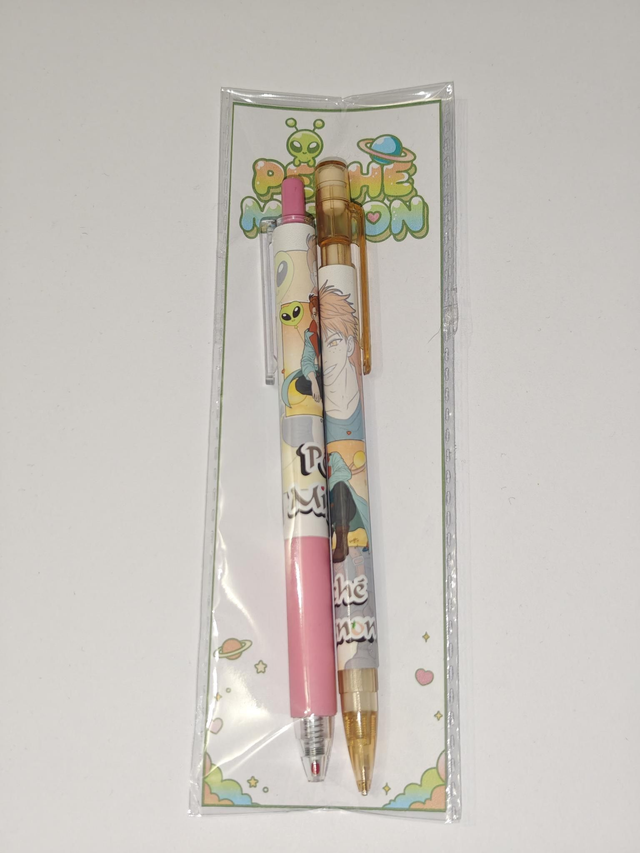Chaque kit comprend un stylo gel noir 0,5 mm et un critérium 0,5 mm (1 seule mine à l'intérieur), décorés à l’effigie d’un personnage, entouré de petites planètes et d’étoiles dans un univers doux et romantique.